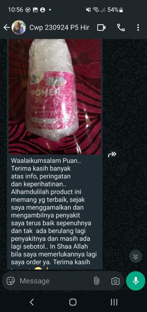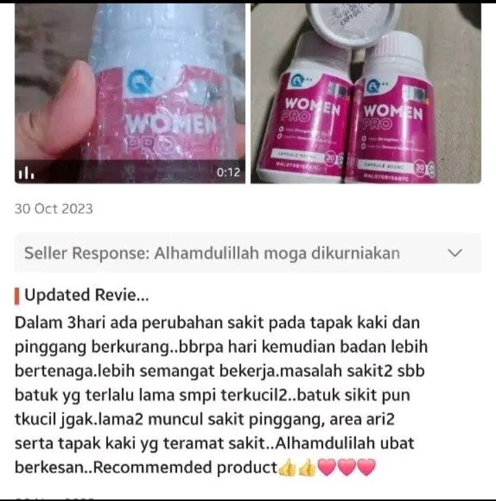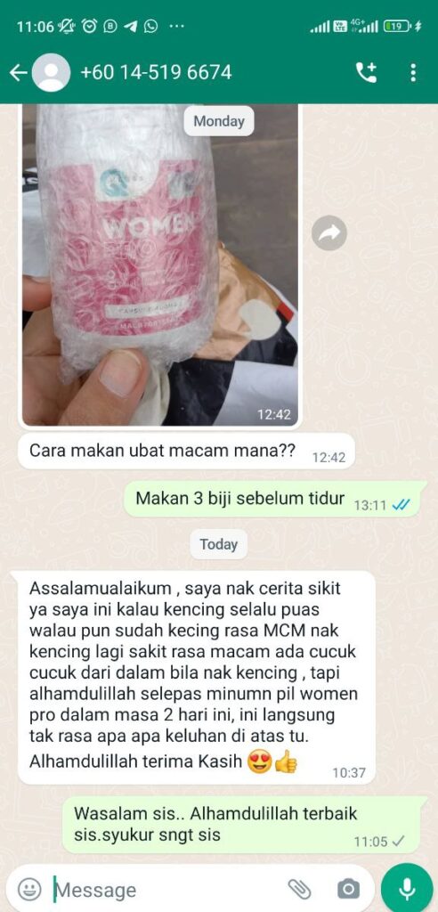 Dibawah ini adalah testimoni Women Pro tau. Kami pon ada terima feedback makan women pro tapi tak berkesan. Bila kami tanya, rupanya sakit dah lama dan beli sebotol sahaja. lepas 2 bulan dia wasap kami, cakap tak berkesan. bila kami tanya cara makan, rupanya makan tak konsisten, 2 bulan baru habis sebotol. Jadi kami nak lelong Harga women Pro dengan harga tak masuk akal siap percuma sebotol Neuroflexx.