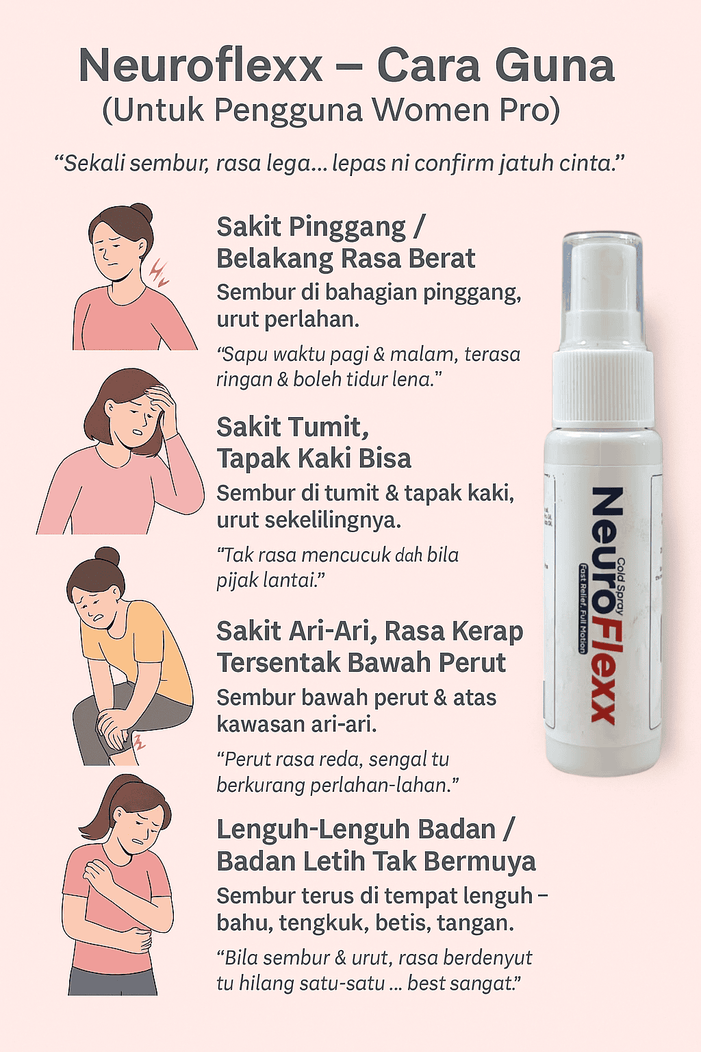 Oh ya, ini sebelum kami nak bagi secara percuma NeuroFlexx ni. HQ suruh terangkan dulu bahawa NeuroFlexx ini sangat-sangat sesuai untuk pengguna Women Pro. untuk yg instant result adalah lenguh2 badan, kalau sembur tempat lenguh tu, dalam 5 minit je, memang rasa hilang lenguh tu. rasa sejukk je. saya sendiri pon guna dan kena beli tau. hehe. kat bawah ni adalah cara guna NeuroFlexx untuk pengguna women Pro
