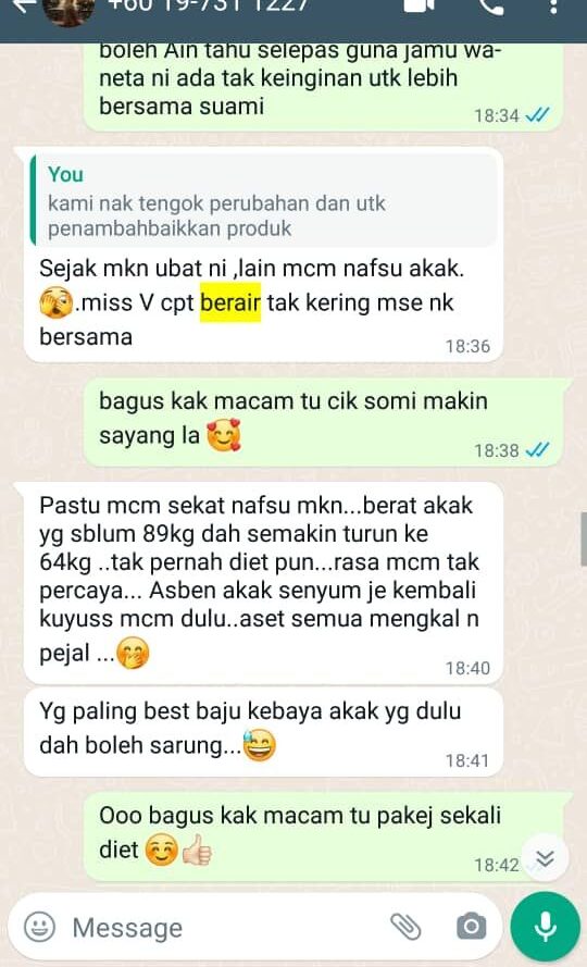 Sebab tu sis terkejut bila kali pertama amalkan Kapsul Jamu Wane-ta ni lepas beberapa minit terus rasa ghairah dan berdenyut. Cik abe pon siap puji dah berair banyak macam dulu-dulu. Memang SEDAP & NIKMAT sangat-sangat bila dah berair + Boleh Klimaks sama-sama!